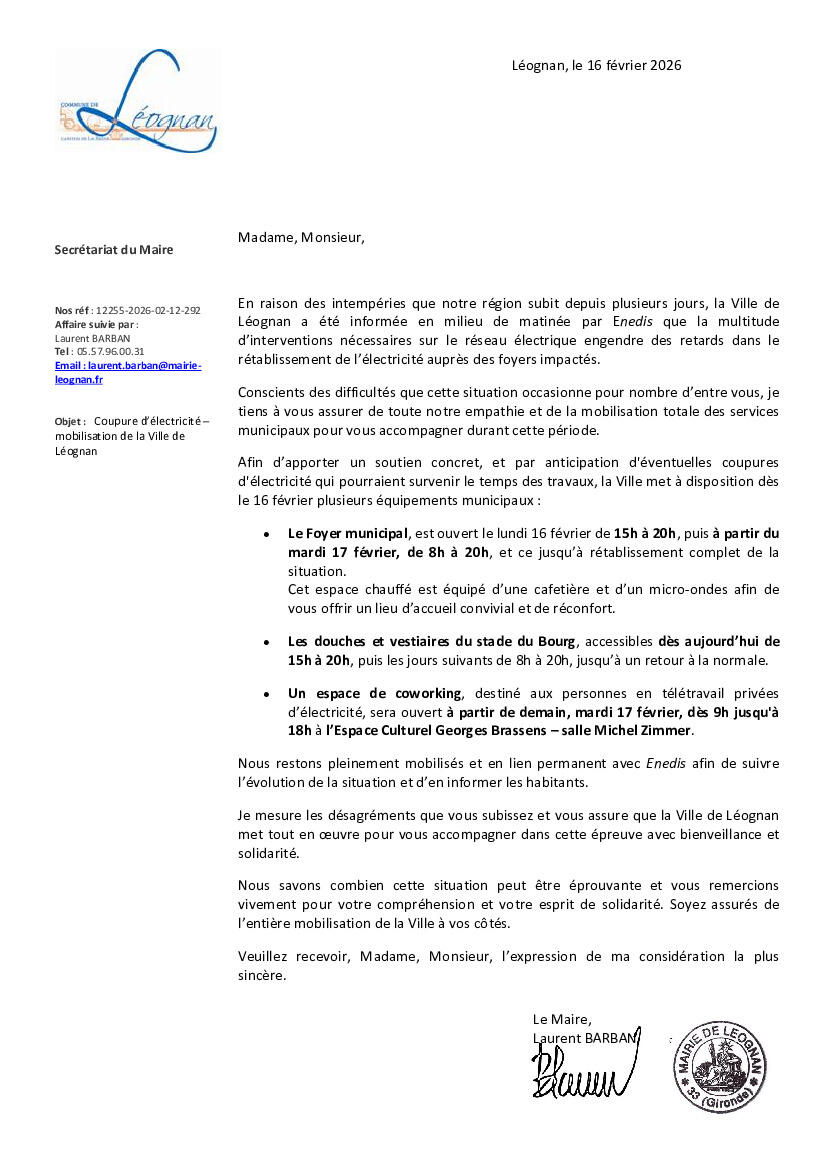 Coupure d’électricité – mobilisation de la Ville de Léognan