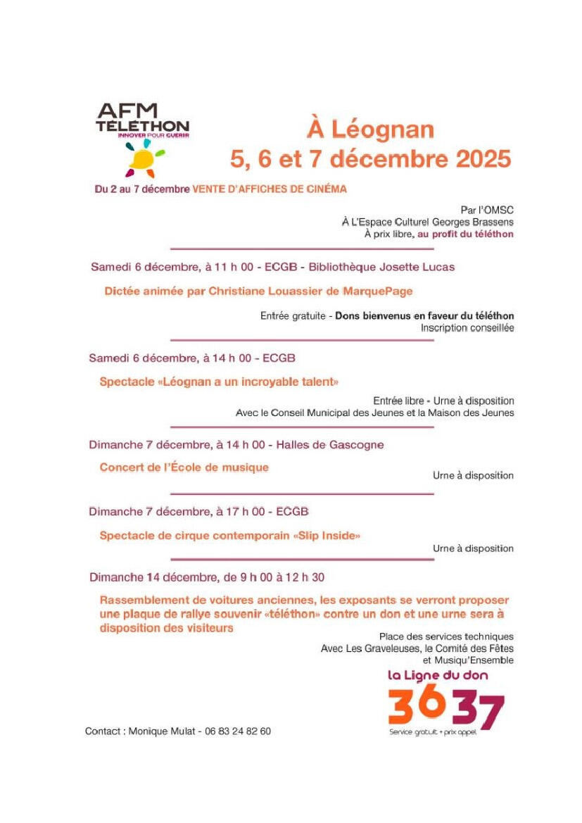 Téléthon 2025 05/12/2025 Léognan se mobilise tout le week-end dans le cadre du Téléthon. Faites vos dons au 3637 (service gratuit + prix d'un appel)