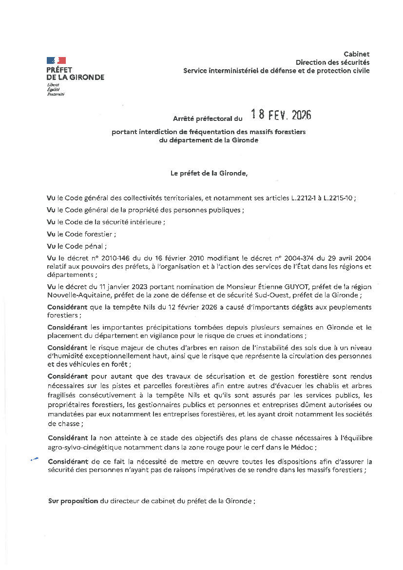 Les forêts publiques et privées sont interdites au public dans tout le département de Gironde.