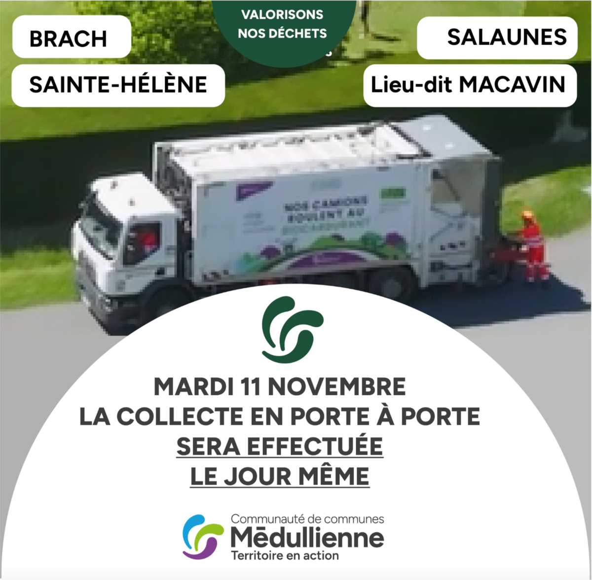 🔸 Les collectes en porte-à-porte seront assurées normalement à Sainte-Hélène, Salaunes, Brach et au lieu-dit Macavin.