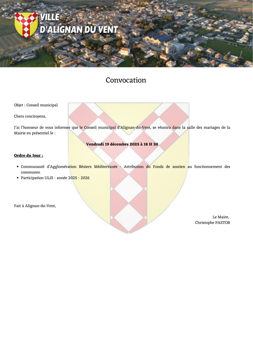 Conseil municipal le vendredi 19 décembre 2025 18h30