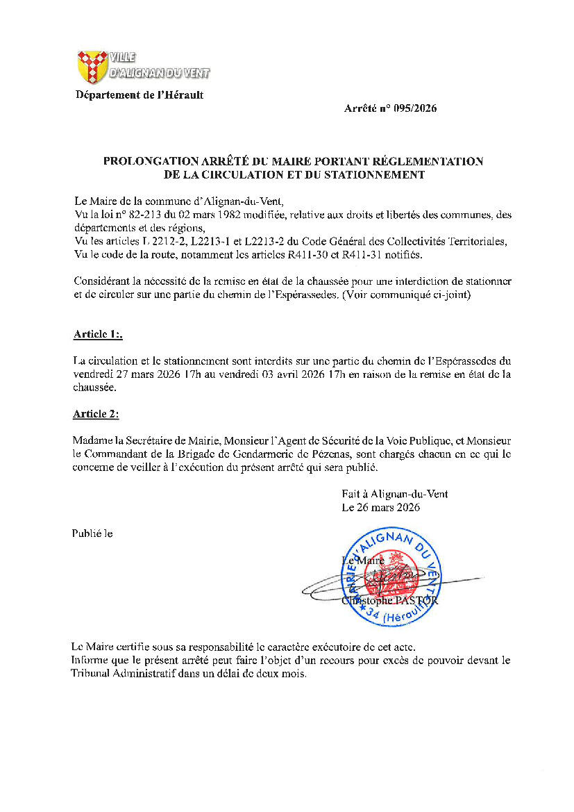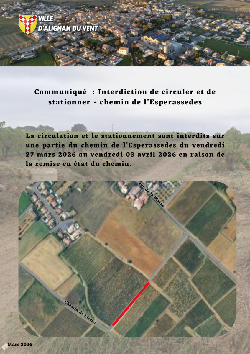 Communiqué : Interdiction de circuler et de stationner 27/03/2026 Chemin de l'Esperassedes Source : Mairie d'Alignan-du-Vent