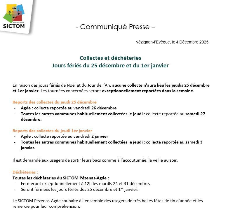 Toutes les collectes du 25 décembre et 1er janvier seront reportées, des collectes supplémentaires de rattrapage auront lieu selon les modalités détaillées dans le communiqué ci-joint.