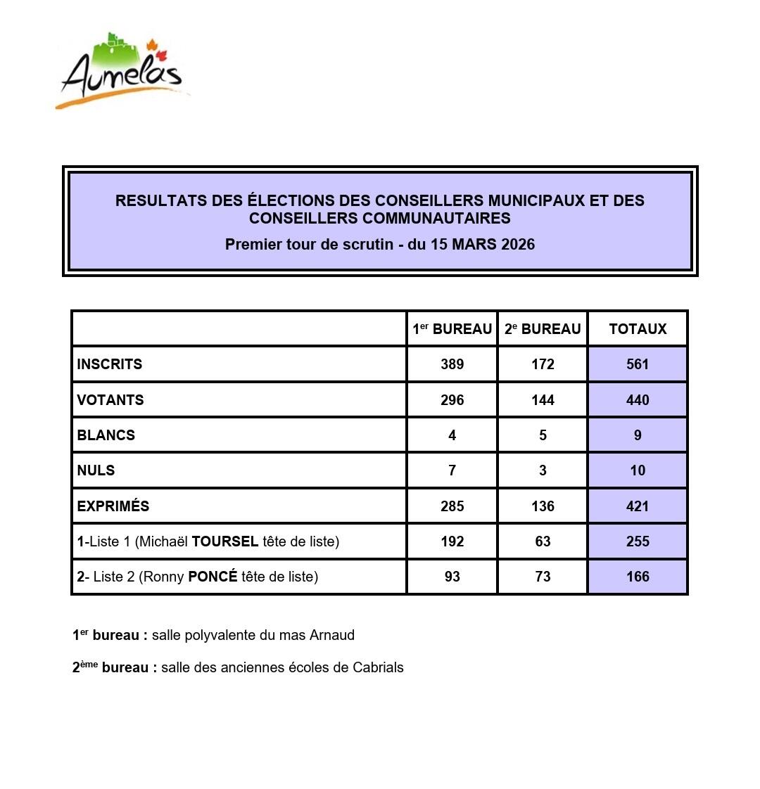 INFO MAIRIE - Resultats Election Municipale 15/03/2026 Ci-joint résultats des élections municipales Aumelas