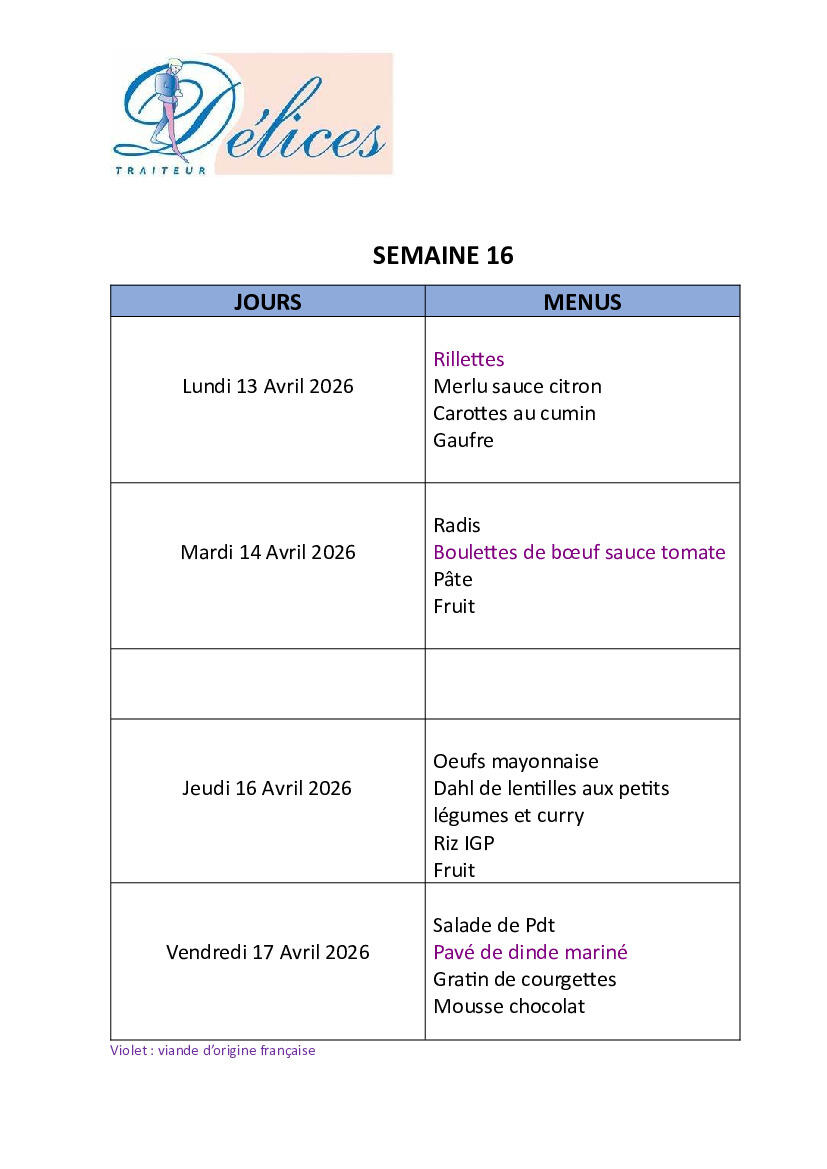 Menu Semaine 16 31/03/2026 Bonjour , Vous trouverez ci joint le menu de la semaine 16. Belle journée. Justine