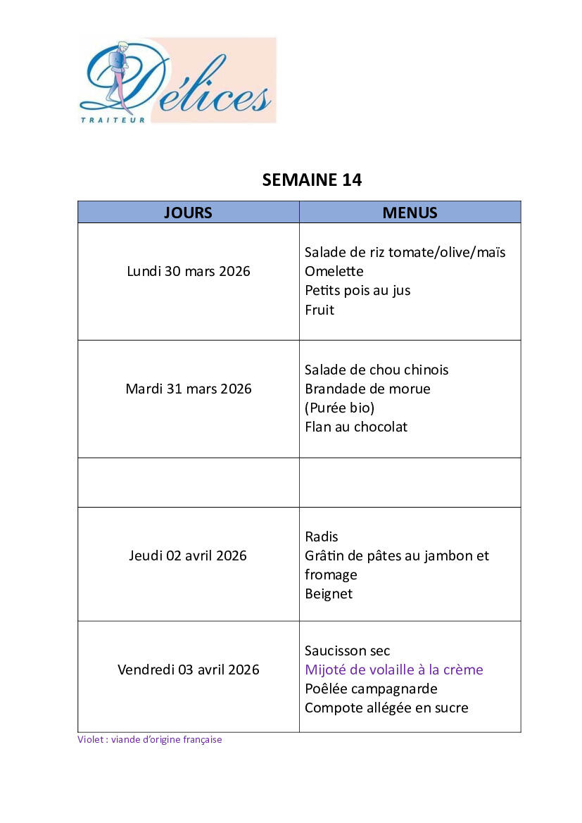 Menus Cantine Pour La Semaine 14 23/03/2026 Vous trouverez en pièce jointe les menus de nos écoliers du 30 mars au 03 avril 2026.