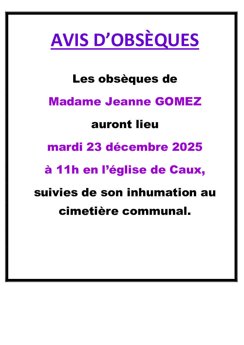 Avis de décés à Caux. Mardi 23/12 à 11h00