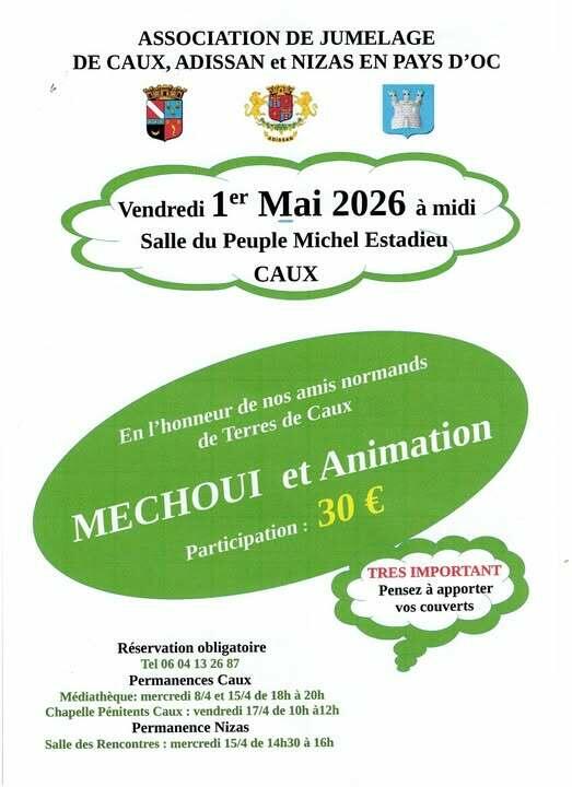 L'"Association de Jumelage Caux Adissan Nizas en Pays d'Oc" organise à l'occasion de la réception des amis normands de Terres de Caux, un méchoui le 1er mai à midi, Salle du Peuple Michel Estadieu à Caux, accompagné d'une animation de l'association "Kara'Caux".