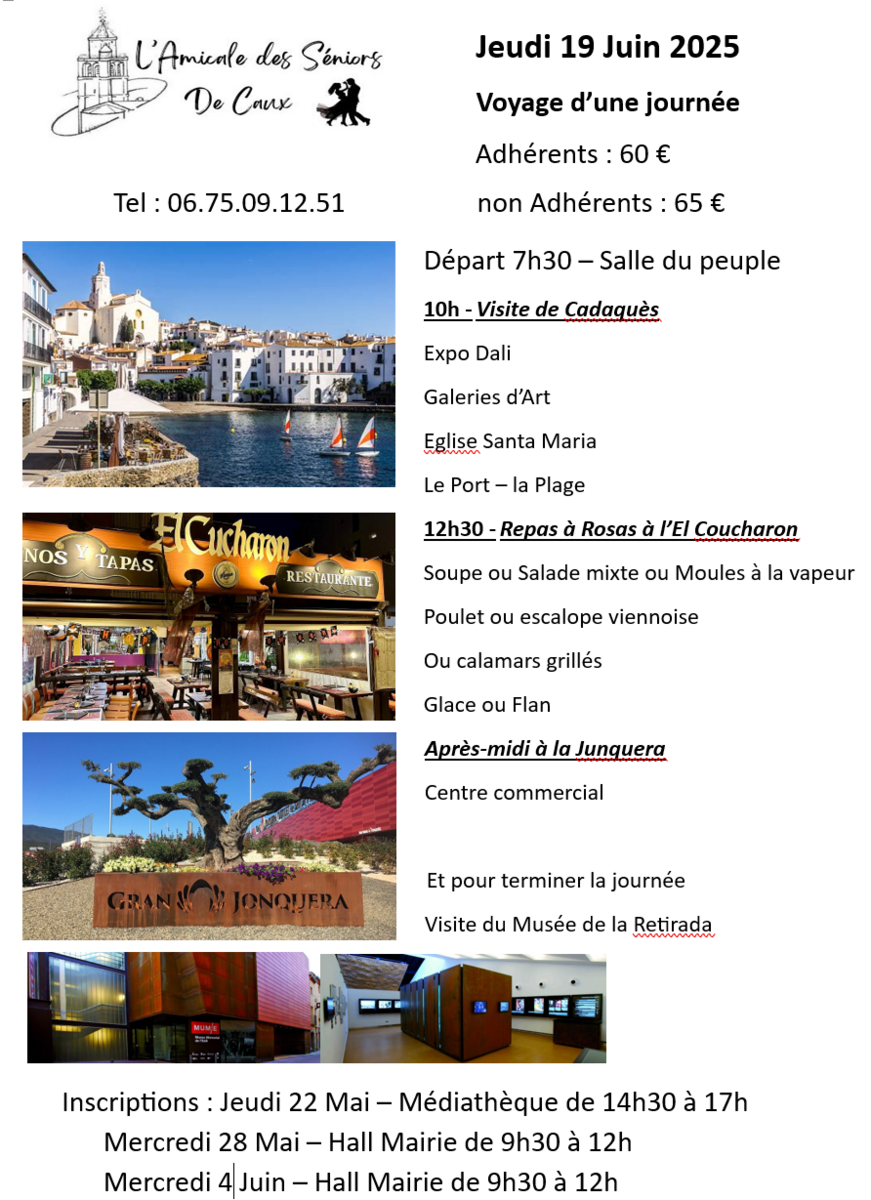 L'"amicale des séniors de Caux" organise un voyage d'une journée en ESPAGNE ouvert à tous mercredi 19 juin : Cadaques, Rosas, La Jonquiera.