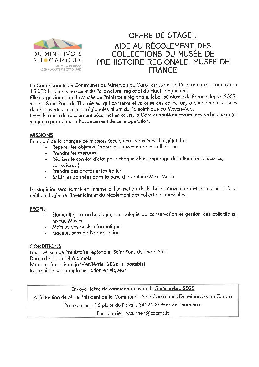 SAINT PONS : Offre de stage Aide recolement collection musée