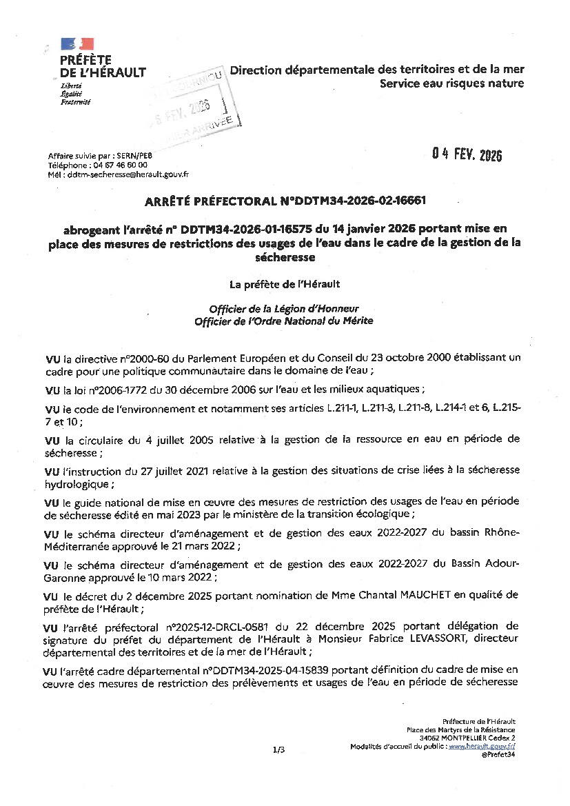 Arrêté préfectoral restriction et usages de l'eau du 4.02.26