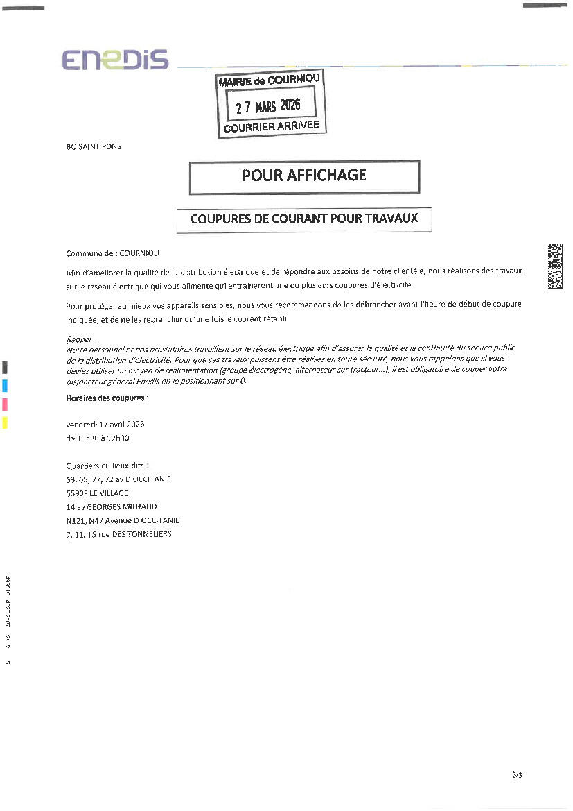 Votre mairie / Actualités / COURNIOU : Coupure électricité le Vendredi 17.04.2026