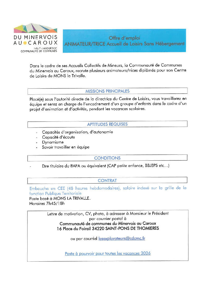 Votre mairie / Actualités / MONS LA TRIVALLE : CDCMC Offre d'emploi Animateur/trice