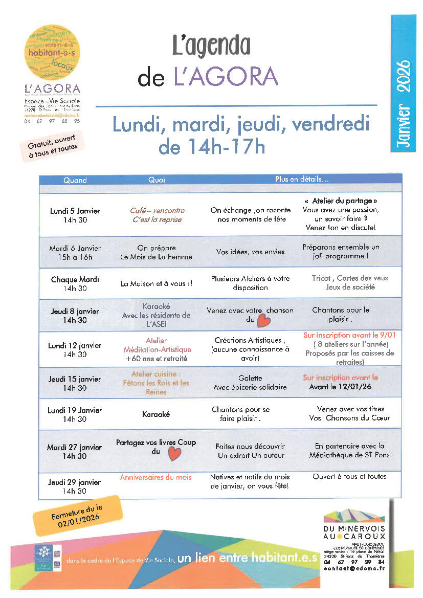 SAINT PONS : Agenda AGORA du mois de Janvier 2026 07/01/2026 Bonjour, Pour information. Bien cordialement