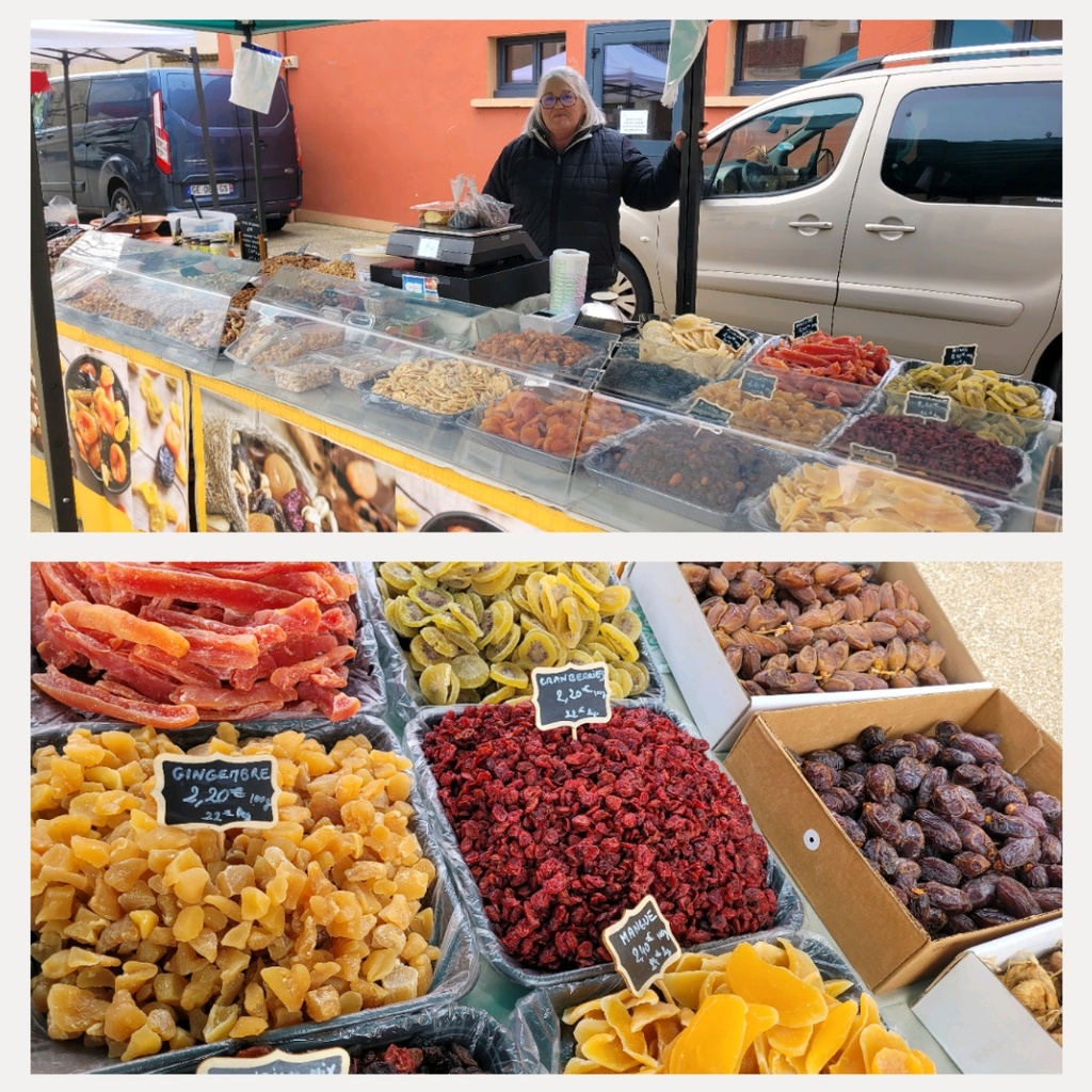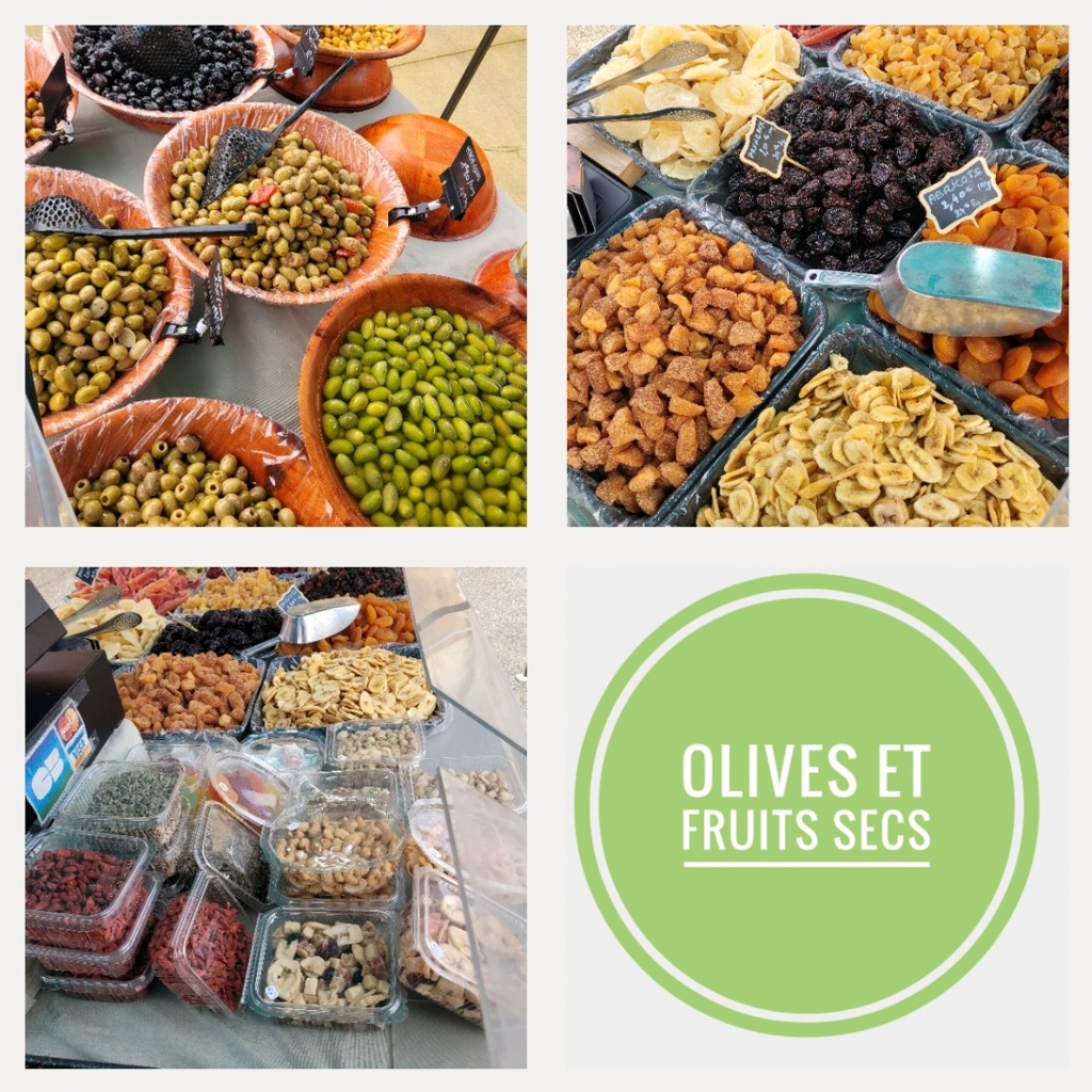 Stand d'OLIVES, fruits secs et déshydratés.
