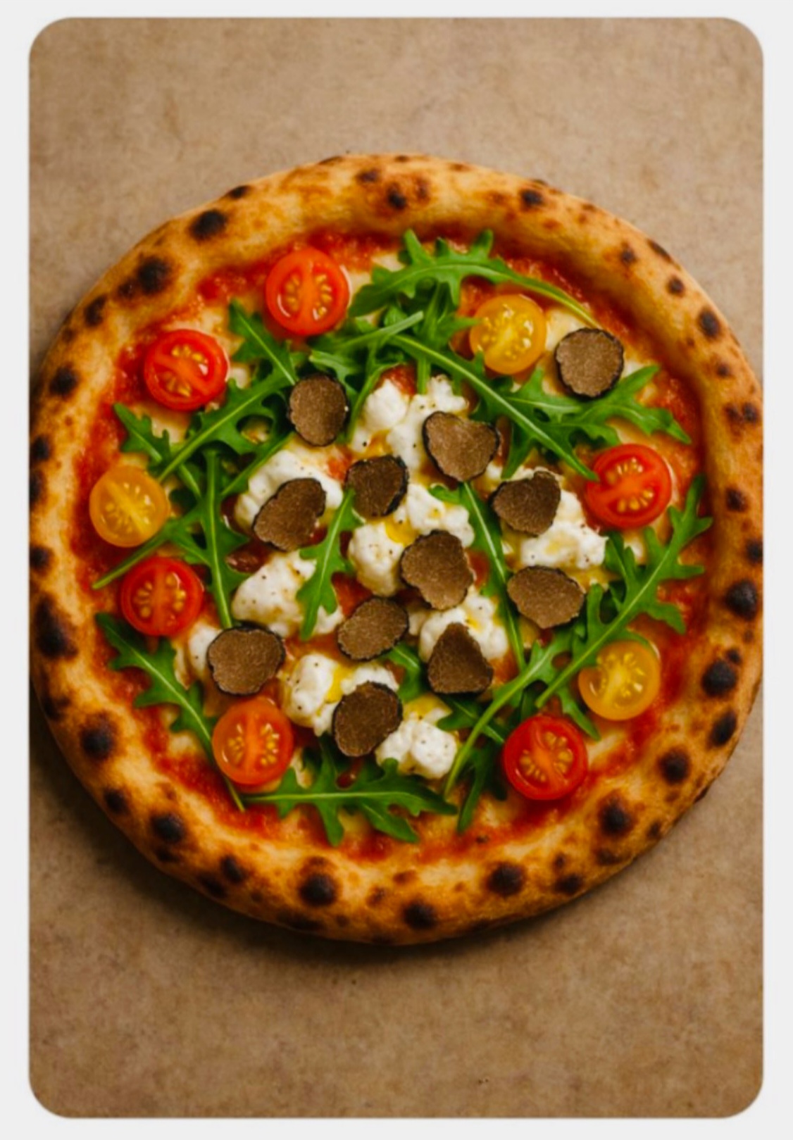 —> sur base de crème de truffe maison, mozzarella Fior Di latter et tomates cerises fraiches.