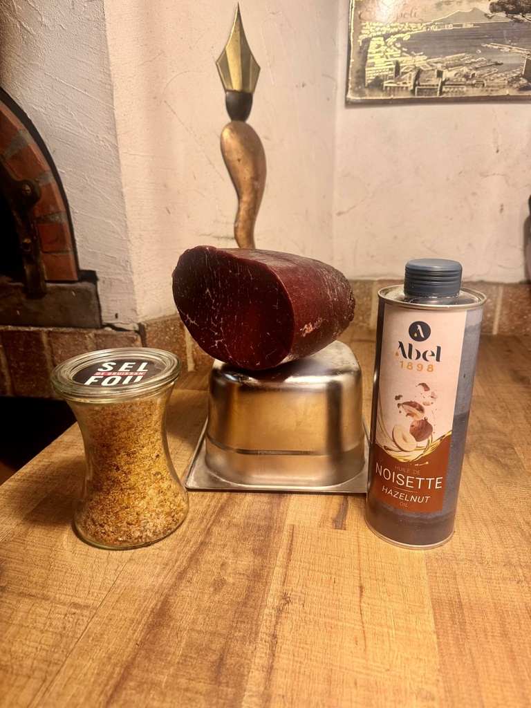 Bresaola de boeuf Black Angus - Stracciatella au sel rose de Gruissan et Huile de Noisette -