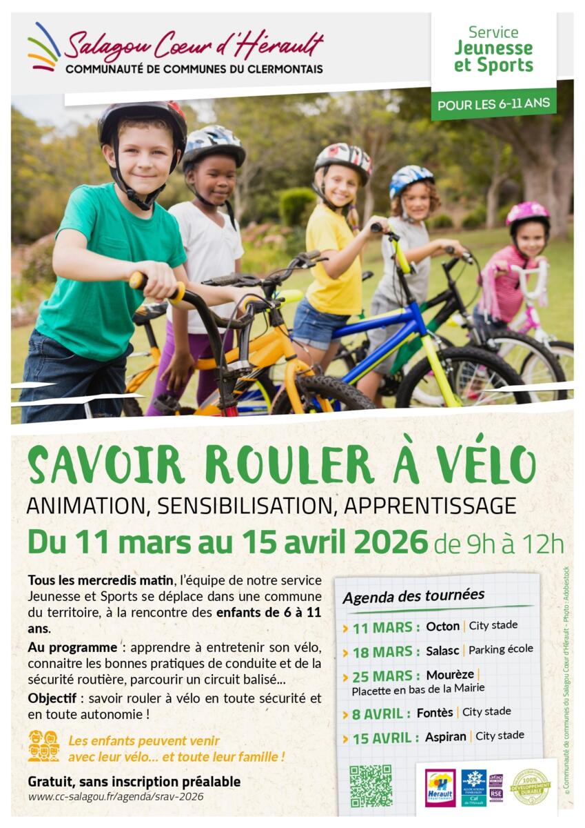 Tout au long de l’année, les équipes du service Jeunesse et Sports de Salagou Cœur d'Hérault donnent rendez-vous aux enfants de 6 à 11 ans du territoire pour des animations « Savoir rouler à vélo ». Un programme d’apprentissage pour leur permettre de devenir autonome à vélo, pratiquer quotidiennement une activité physique et se déplacer de manière écologique et économique.