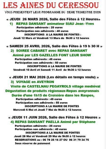Voici le programme du 2ème trimestre de l'association Les Aînés du Céressou.