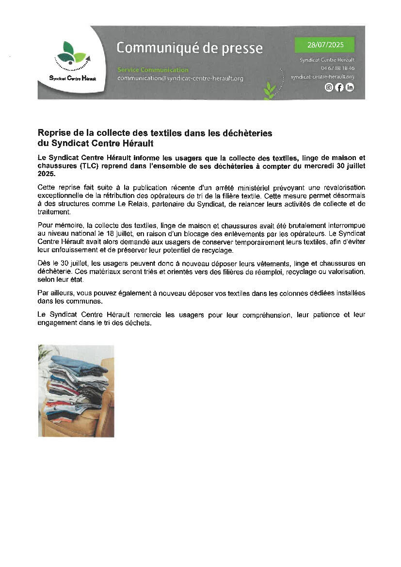 REPRISE COLLECTE DES TEXTILES EN DECHETERIE