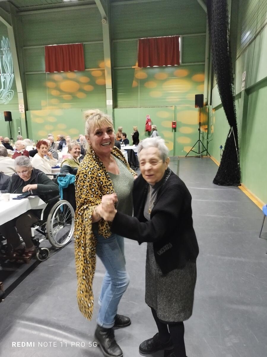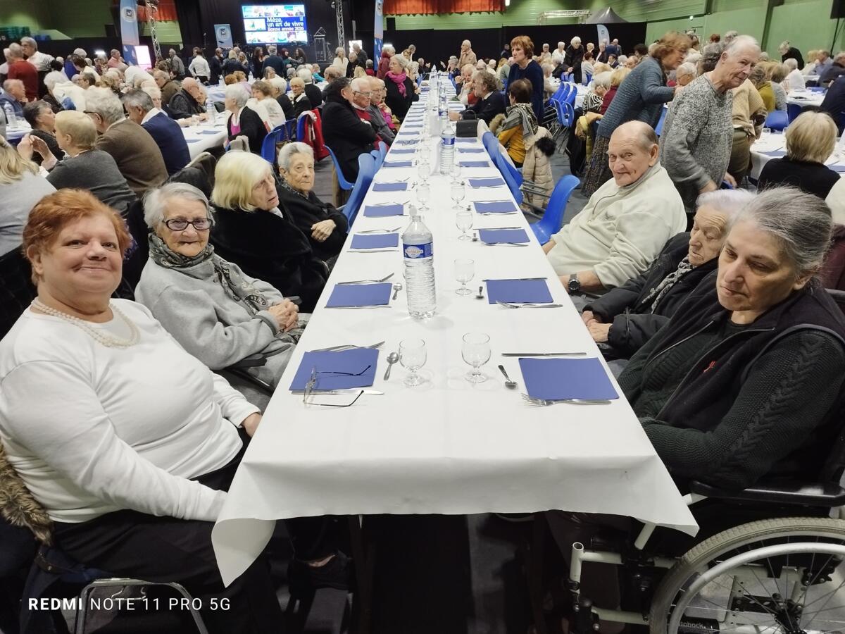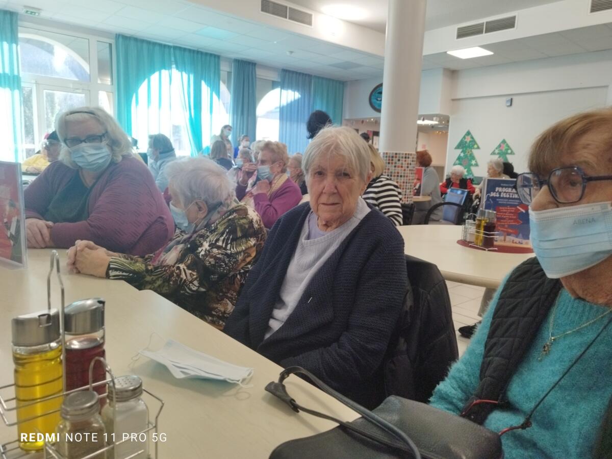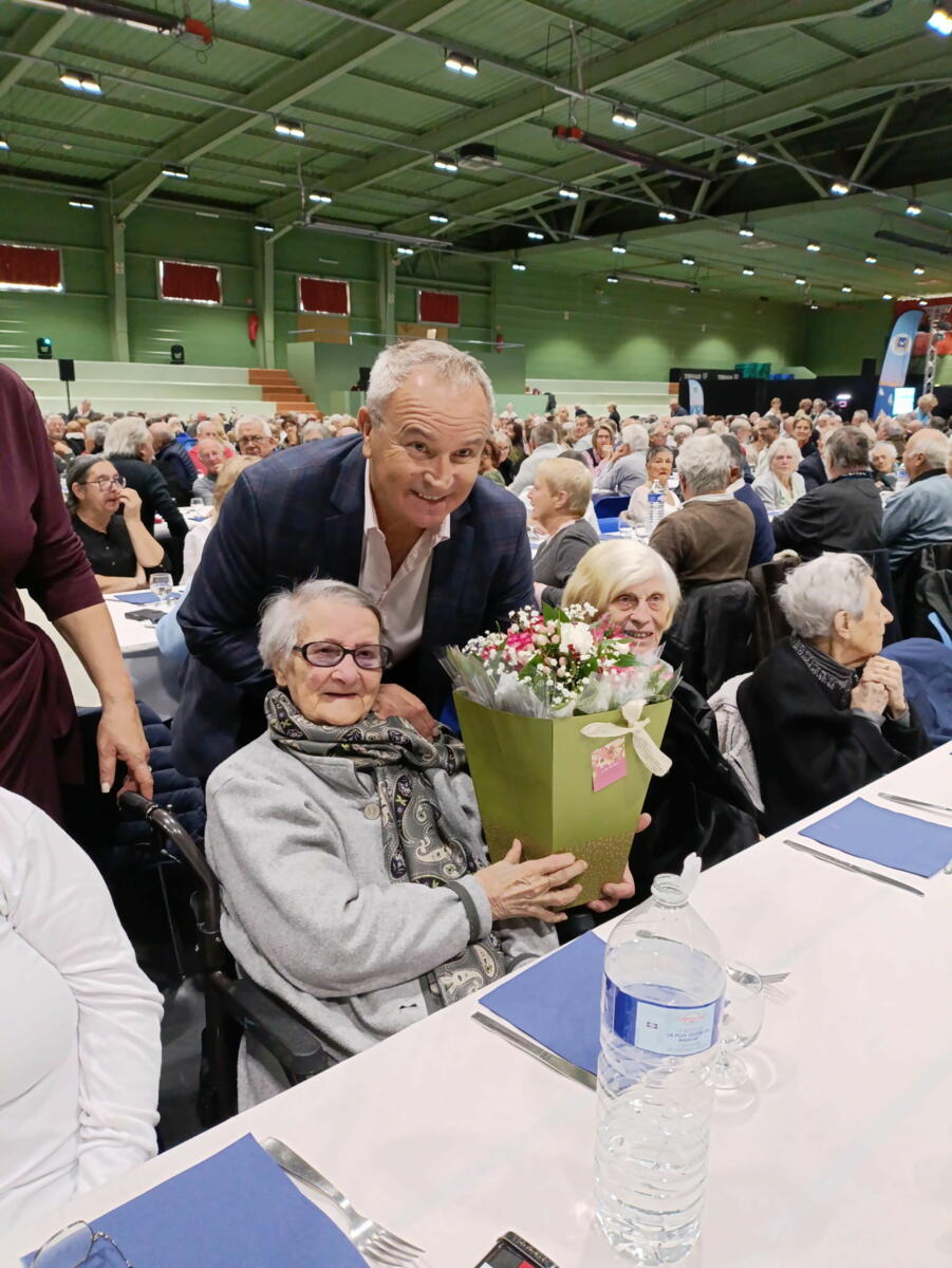 Nous avons également participé au repas des anciens. L'ambiance était au rendez-vous. Le moment fort de la journée fut sans aucun doute la mise à l'honneur de l'une de nos résidentes. Étant la doyenne de l'assemblée, elle a reçu un magnifique bouquet de fleurs des mains de Monsieur le Maire.