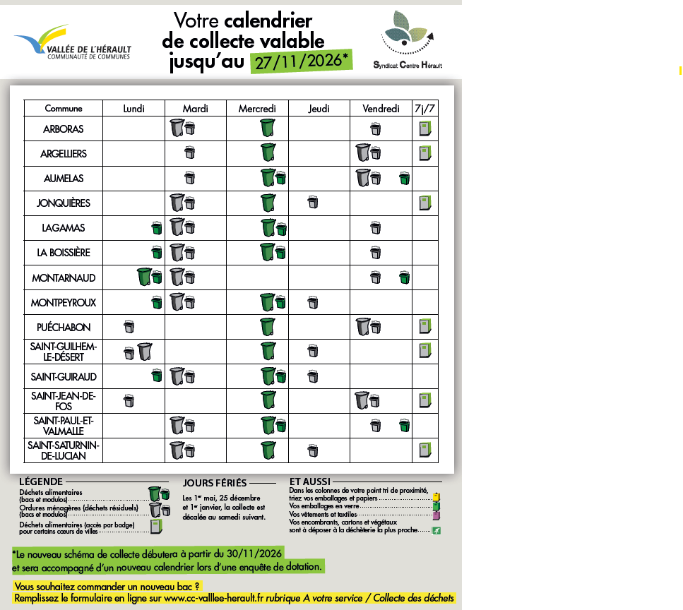 Le calendrier de collecte 2026 a été mis en ligne par la Communauté de communes Vallée de l'Hérault.