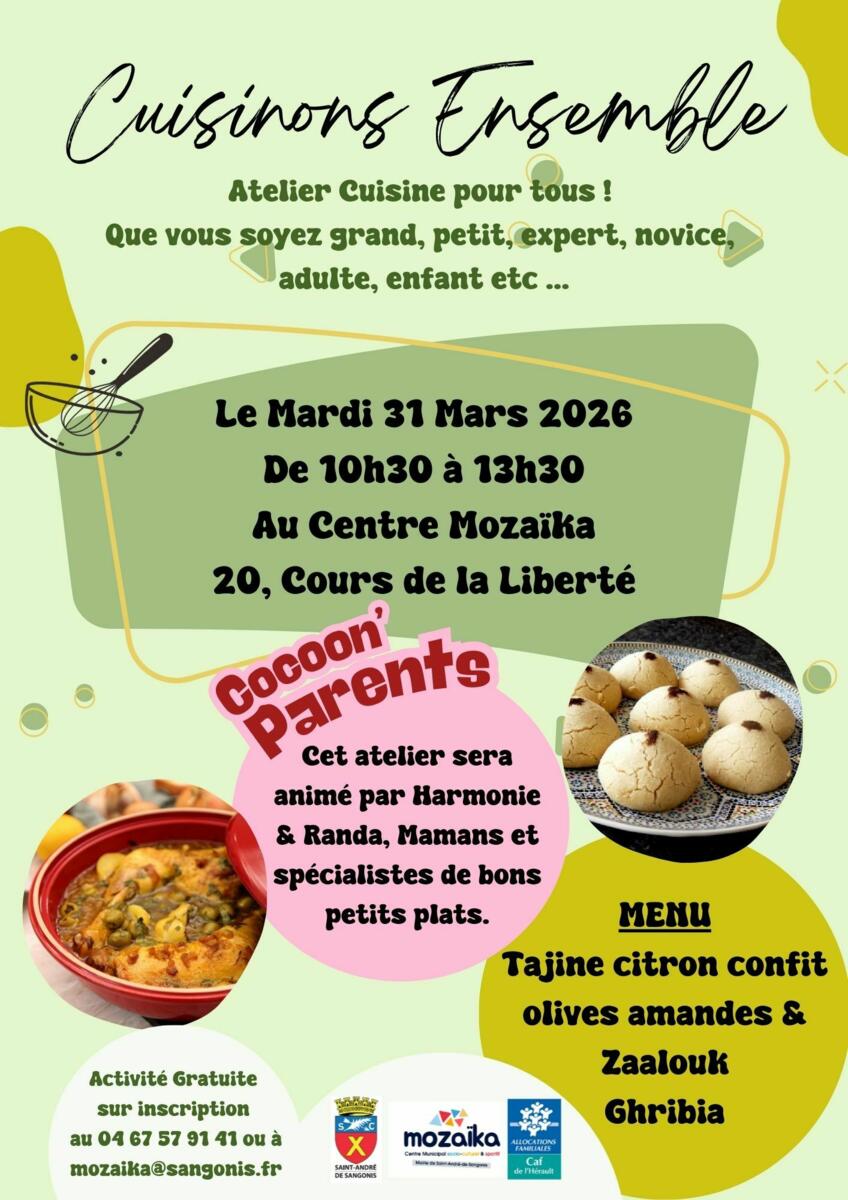 Cuisinons Ensemble (cet atelier est ouvert à tous les publics), le Mardi 31 Mars de 10h30 à 13h30 (préparation et partage du repas) à Mozaïka. Menu : Tajine au citrons confits olives et amandes / Zaalouk / Ghribia. L'atelier est animé par Harmonie et Randa (Cocoon' Parents).