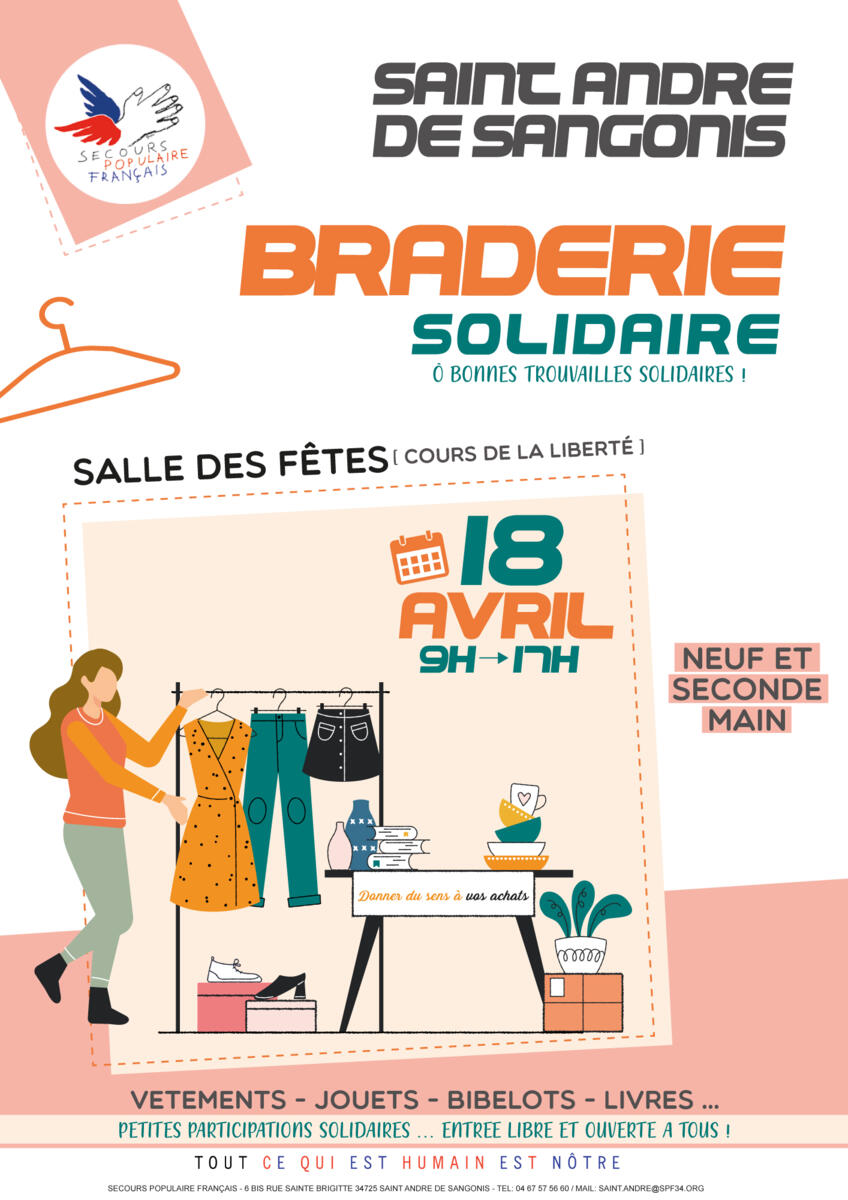 Exceptionnellement, les vêtements de seconde main adultes seront à 1,50 € l'unité. Les vêtements de seconde main pour les enfants seront eux à 1 € le lot de 4. Les manteaux et les chaussures de seconde main seront eux à 2 €. Ouvert à tous et toutes ! Plus d'infos : 04 67 57 56 60