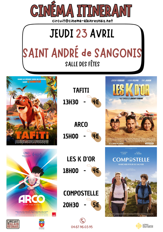 Rendez-vous jeudi 23 avril pour votre cinéma mensuel, à la salle des fêtes de Saint-André-de-Sangonis. Au programme : 18h : Les enfants de la résistance / 4€ 20h30 : Chers parents / 5€
