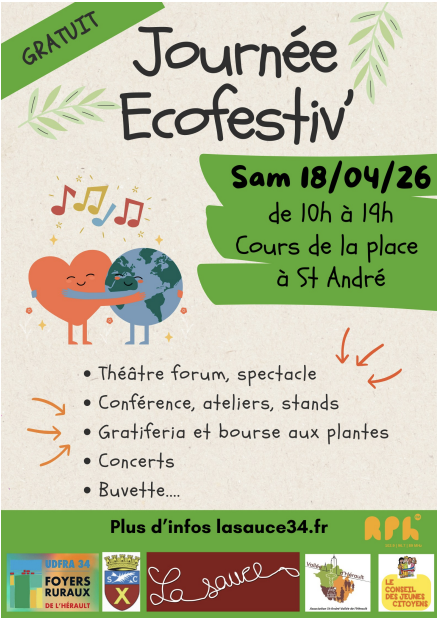- Dès 10h : gratiferia sur inscription (vide-grenier 100 % gratuit), bourse aux plantes, vente de plants par Hortignac (lycée agricole de la Vallée de l’Hérault), atelier rempotage, atelier de vulgarisation scientifique (qu’est-ce que l’énergie ? Mieux comprendre le cycle de vie de nos smartphones)