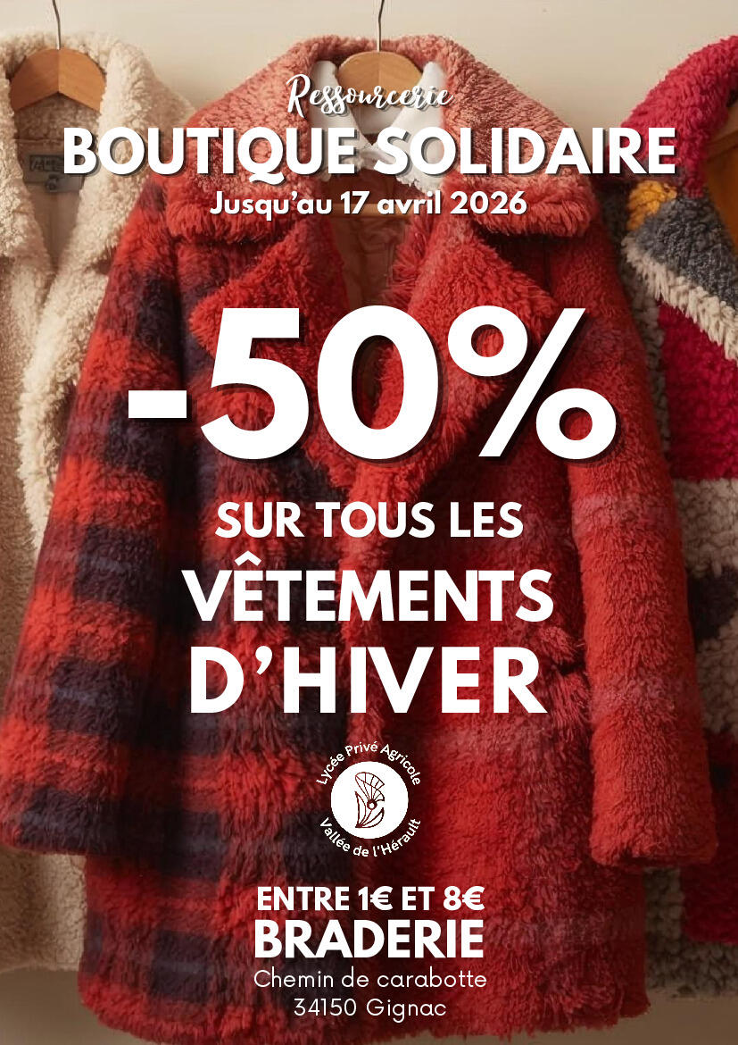 La Boutique Solidaire organise une braderie avec -50 % sur tous les vêtements d’hiver jusqu'au 17 avril afin de faciliter l’accès à des vêtements à prix réduit (entre 1€ et 8€) pour les habitants et d’écouler le stock de la saison.