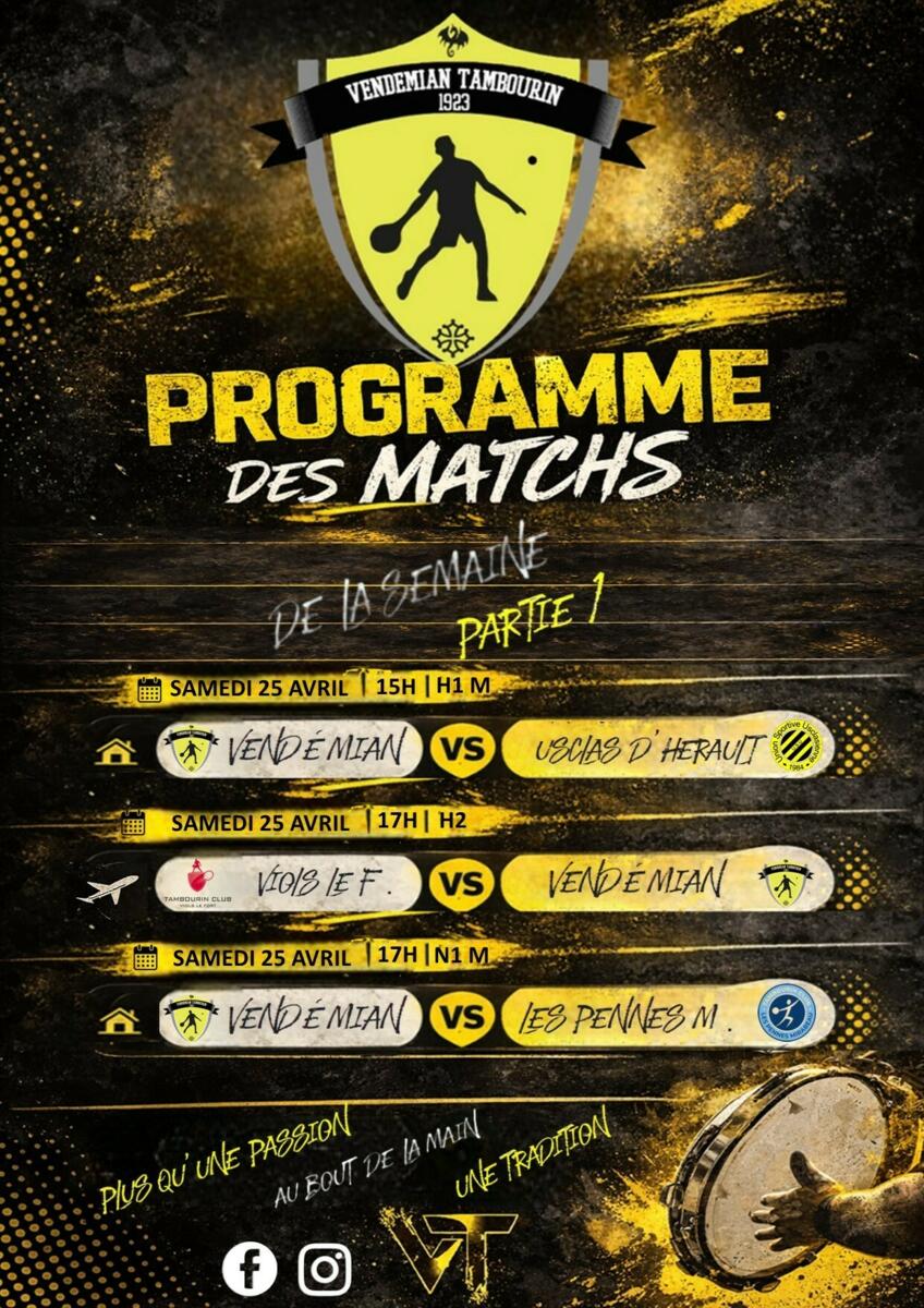 Tambourin : matchs du weekend du 25/26 avril 21/04/2026 Programme des matchs du samedi 25 et dimanche 26 avril