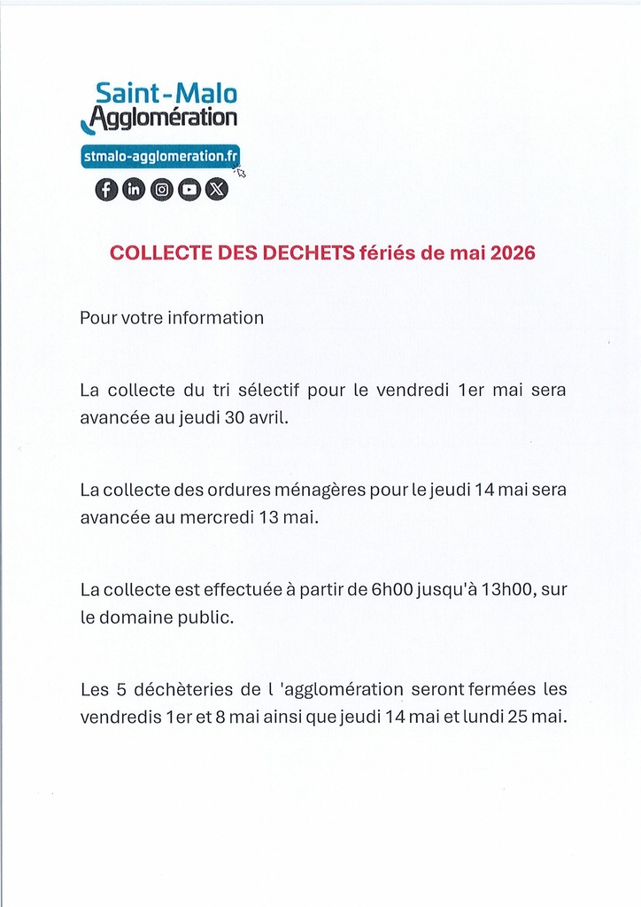 / COLLECTE DES DECHETS fériés de mai 2026