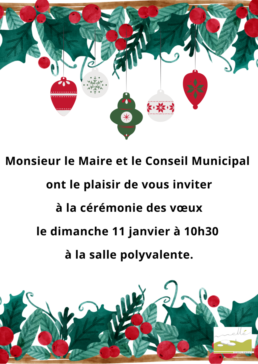 Monsieur le Maire et le Conseil Municipal ont le plaisir de vous inviter à la cérémonie des vœux le dimanche 11 janvier à 10h30 à la salle polyvalente.