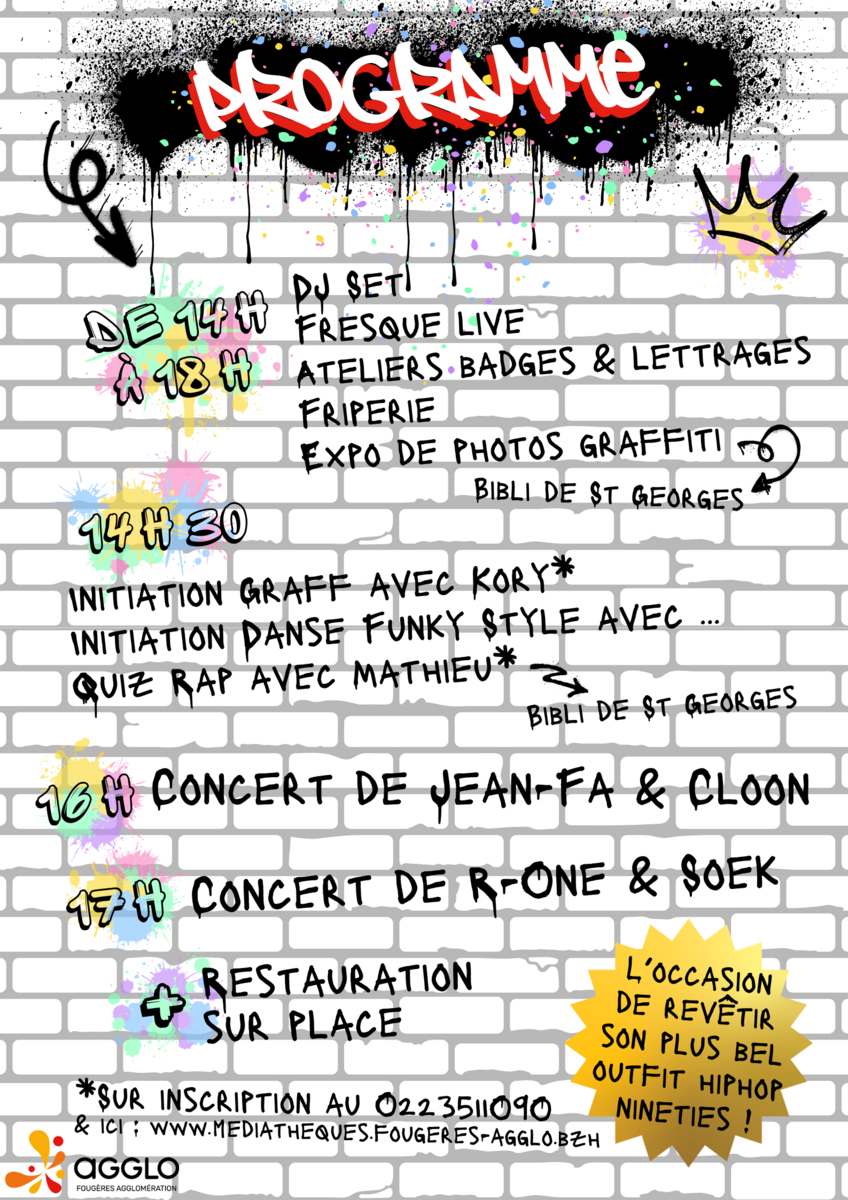 Le samedi 24 mai de 14h à 18h, se tiendra le festival HIP-HOP CAMPUS au collège foufoufou de St Georges de Reintembault organisé par les médiathèques de Fougères Agglo. Un programme riche vous attend ! Concerts, ateliers, danse, démonstration... !