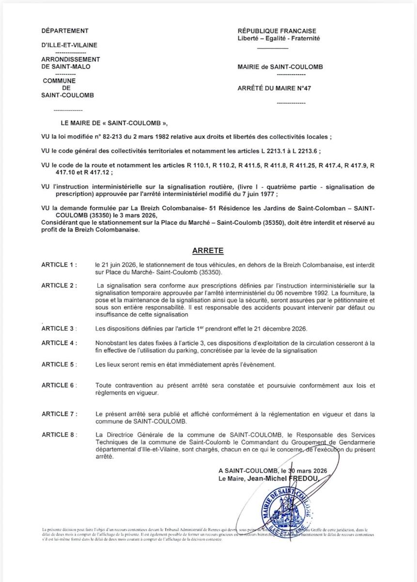 Le 21 juin 2026, le stationnement de tous véhicules, en dehors de la Breizh Colombanaise, est interdit sur Place du Marché- Saint-Coulomb (35350).
