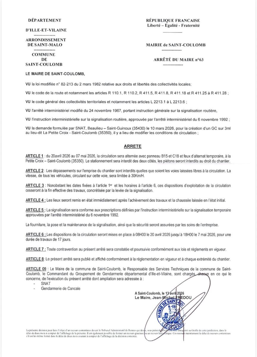 Du 20avril 2026 au 07 mai 2026, la circulation sera alternée avec panneau B15 et C18 et feux d'alternat temporaire, à la Petite Croix - Saint-Coulomb (35350). Le stationnement sera interdit des deux côtés, les piétons seront interdits au droit du chantier.