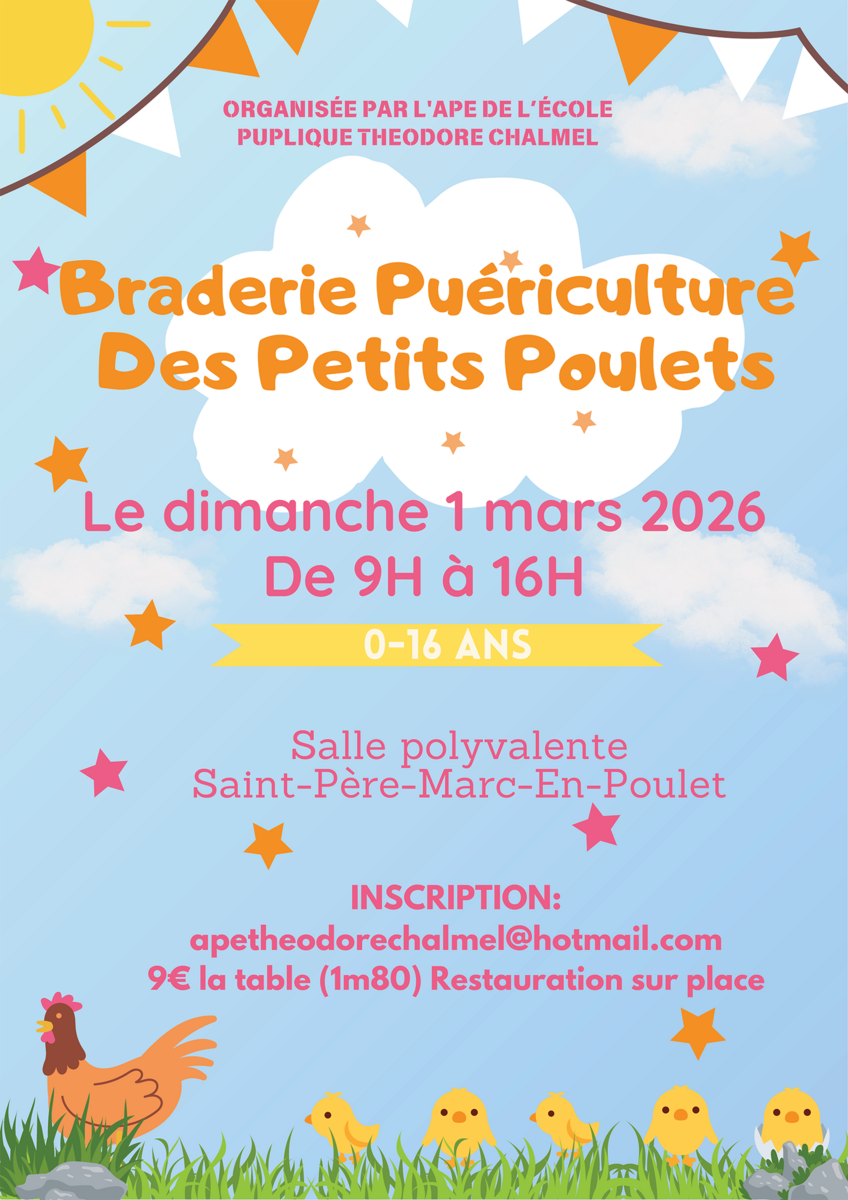 BRADERIE DES PETITS POULETS 28/02/2026 BRADERIE PUERICULTURE DIMANCHE 1ER MARS 9H / 16H SALLE POLYVALENTE Source : Mairie de Saint-Père-Marc-en-Poulet
