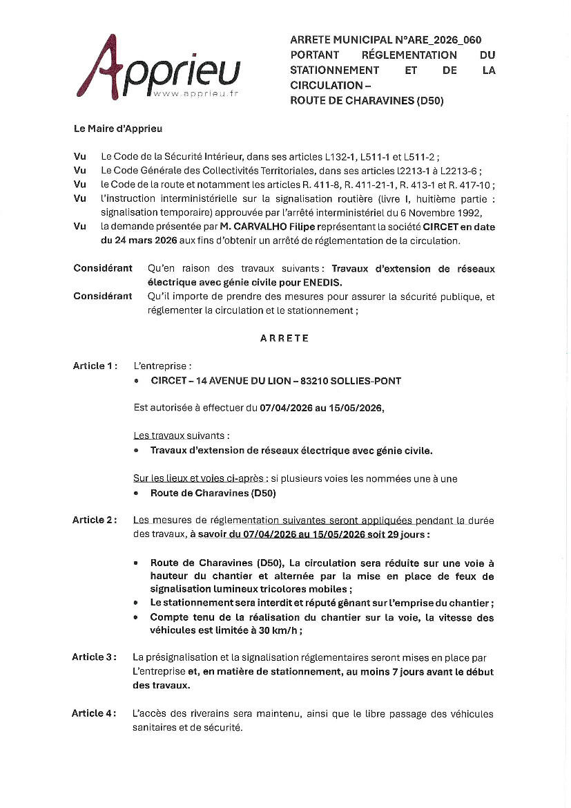 La présignalisation et la signalisation réglementaires seront mises en place par L'entreprise et, en matière de stationnement, au moins 7 jours avant le début des travaux.