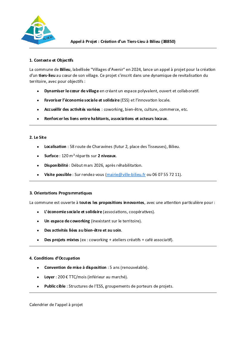 La commune de Bilieu, labellisée « Villages d’Avenir » en 2024, lance un appel à projet pour la création d’un tiers-lieu au cœur de son village. Si ce projet vous intéresse, vous pouvez consulter le cahier des charges et le dossier de candidature sous le lien suivant www.sudest-marchespublics.com