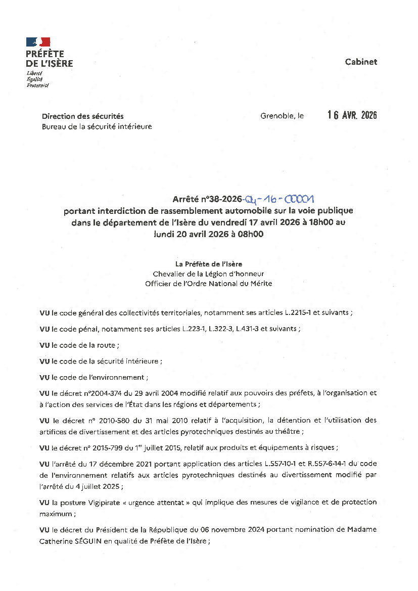 Interdiction rassemblement automobile du 17 au 20/04/2026 17/04/2026 voir arrêté Source : Mairie de Bilieu