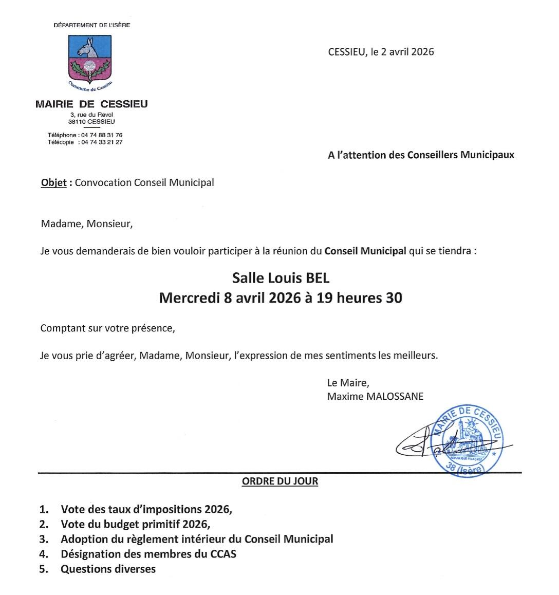 Le prochain conseil municipal aura lieu mercredi 8 avril à 19h30 en salle Louis Bel.