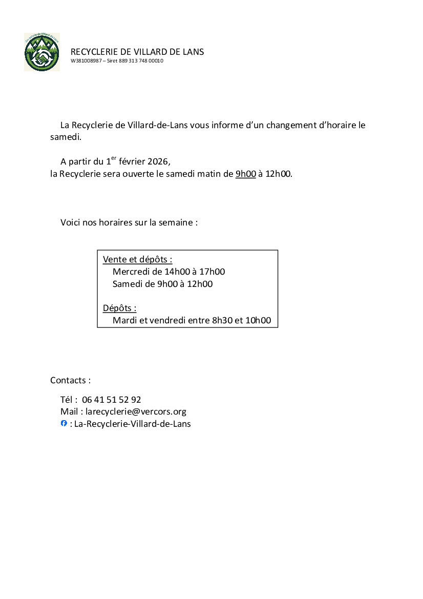 RECYCLERIE CHANGEMENT D'HORAIRES LE SAMEDI