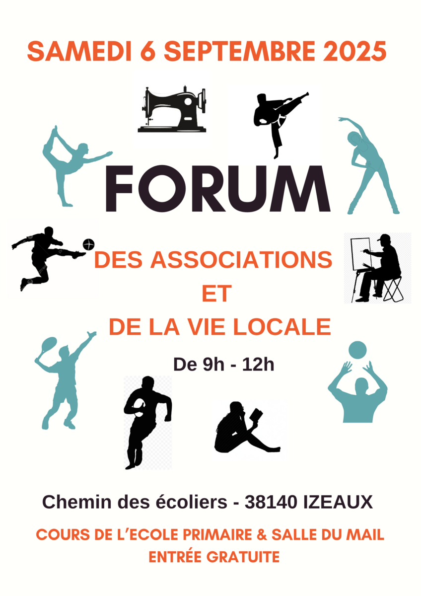 Le forum des associations et de la vie locale aura lieu le samedi 6 septembre de 9h à12h dans la cour de l'école primaire et à la salle du mail.