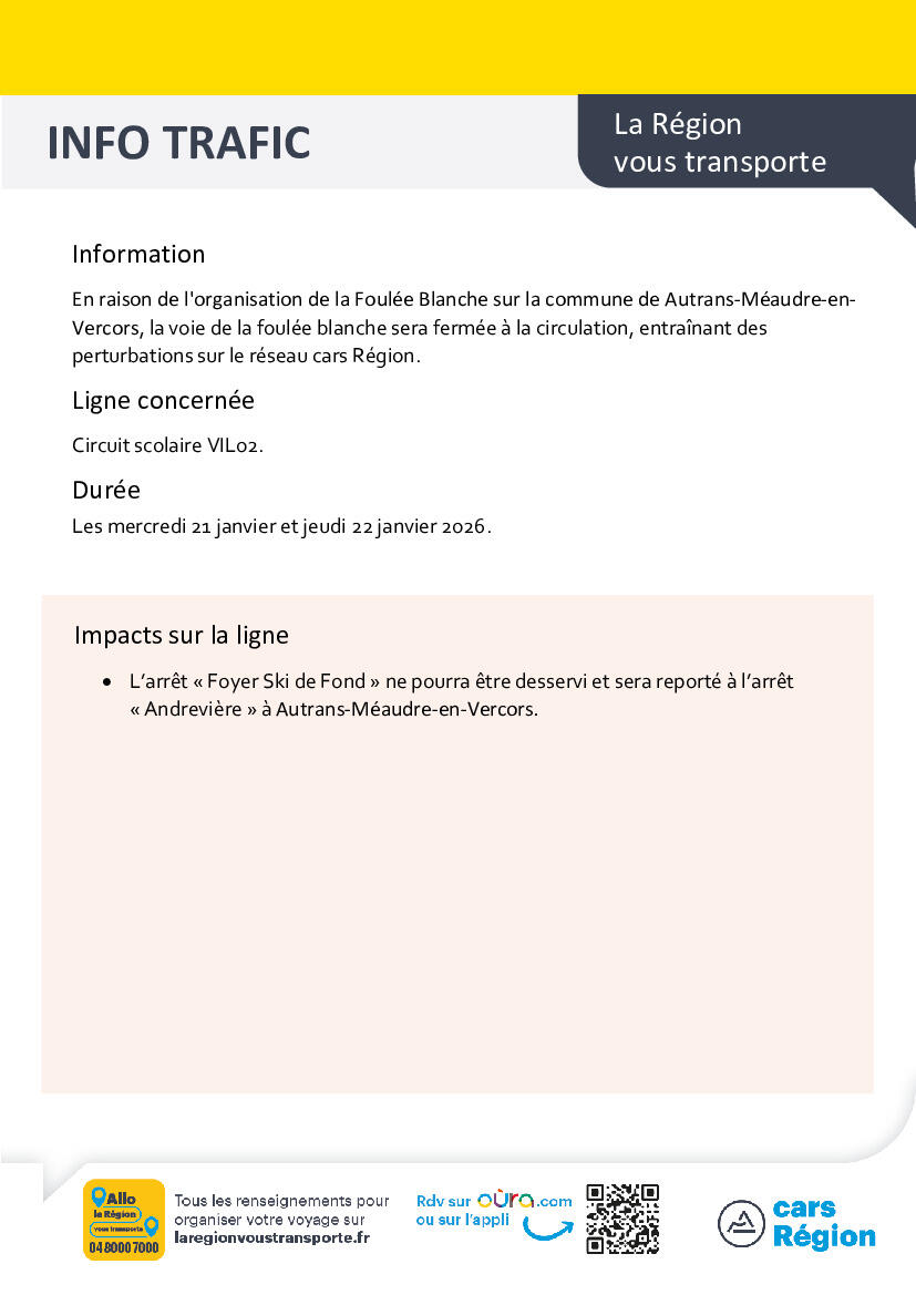 En raison de l'organisation de la Foulée Blanche, la voie de la foulée blanche sera fermée à la circulation, entraînant des perturbations sur les réseau cars Région.