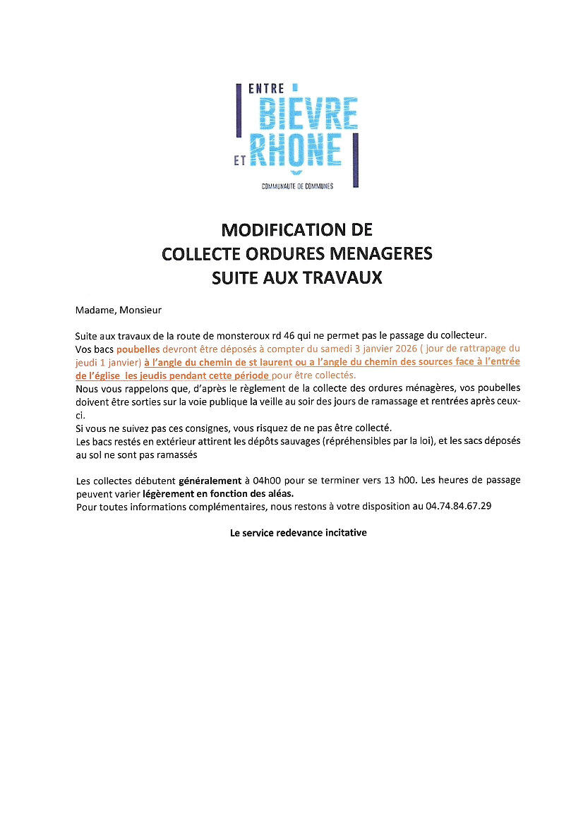 COLLECTE ORDURES MENAGERES PENDANT TRAVAUX RD 46