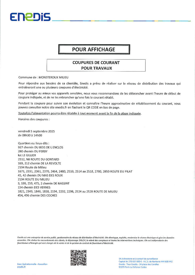 De 8h30 à 14h le vendredi 05/09/25, coupure de courant pour travaux.