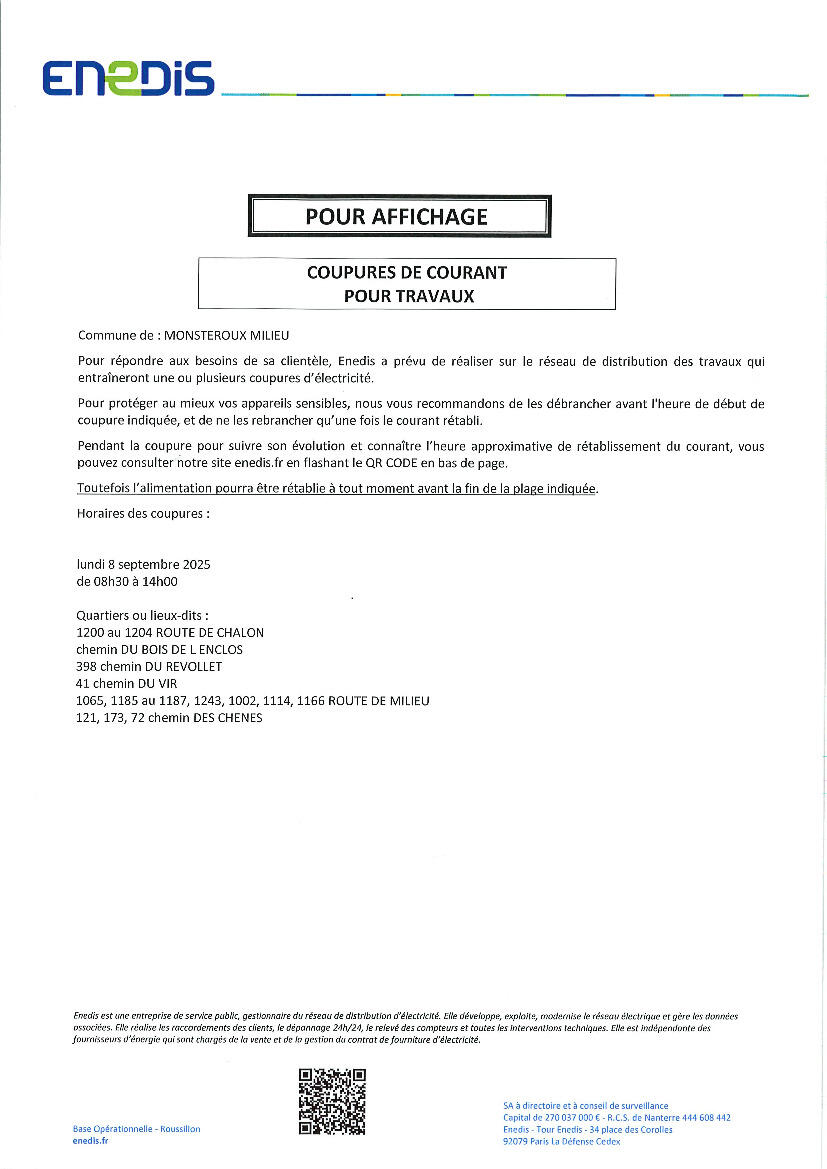 De 8h30 à 14h le lundi 08/09/25, coupure de courant pour travaux.