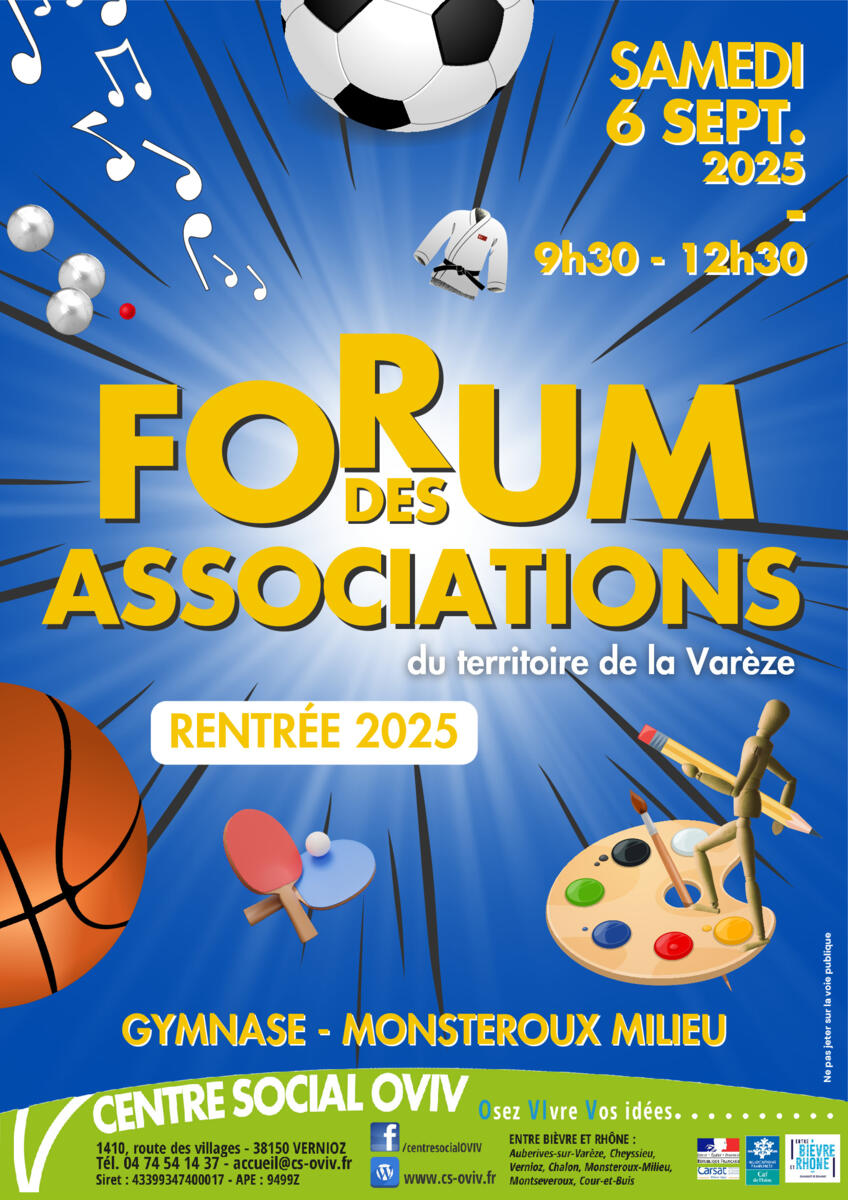 Le Forum des Associations du territoire de la Varèze aura lieu le samedi 6 septembre 2025 de 9h30 à 12h30 au Gymnase de Monsteroux-Milieu.