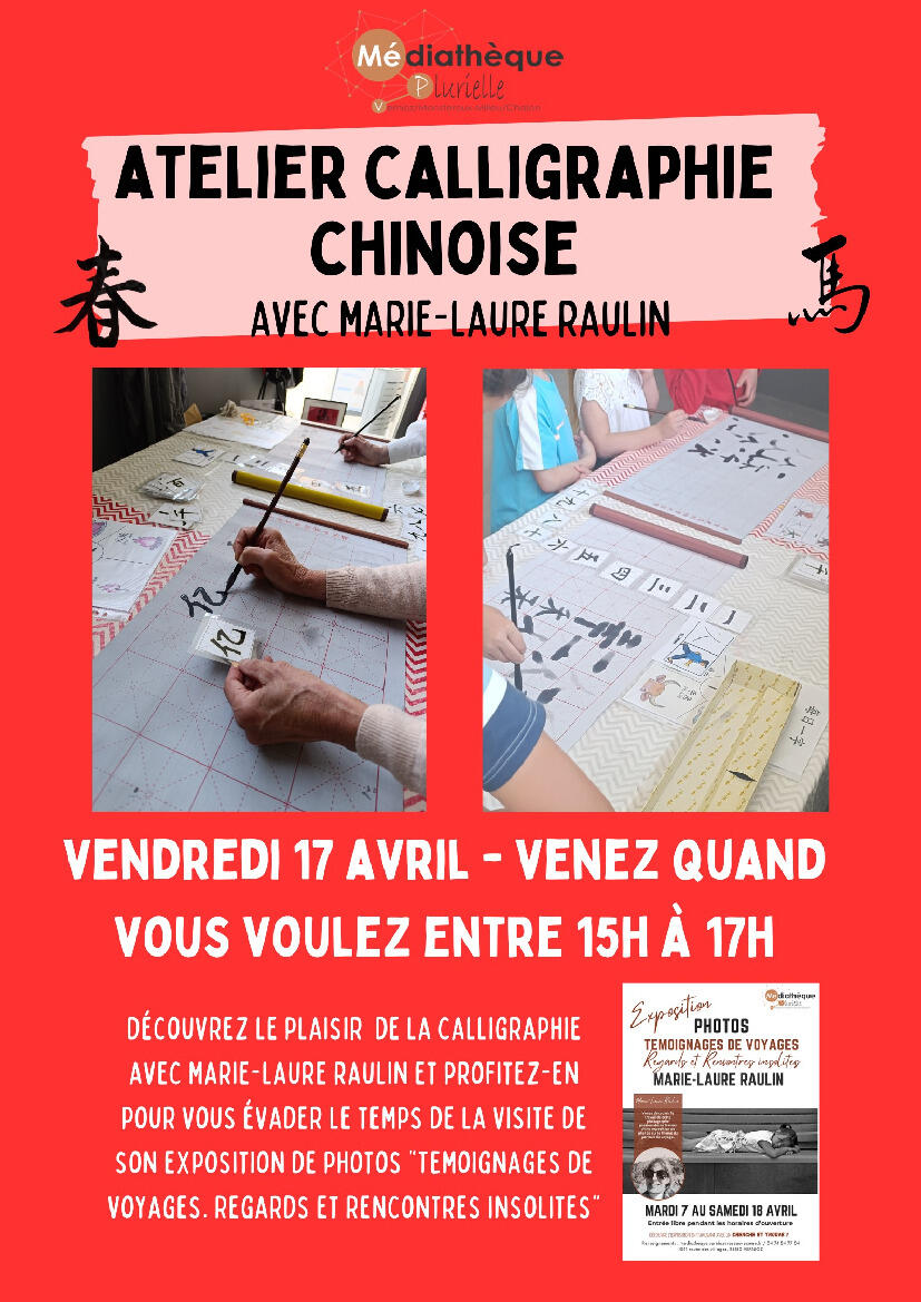 🖌 MEDIATHEQUE PLURIELLE - ATELIER CALLIGRAPHIE CHINOISE 🖌 13/04/2026 Vendredi 17 Avril de 15h à 17h Médiathèque Vernioz